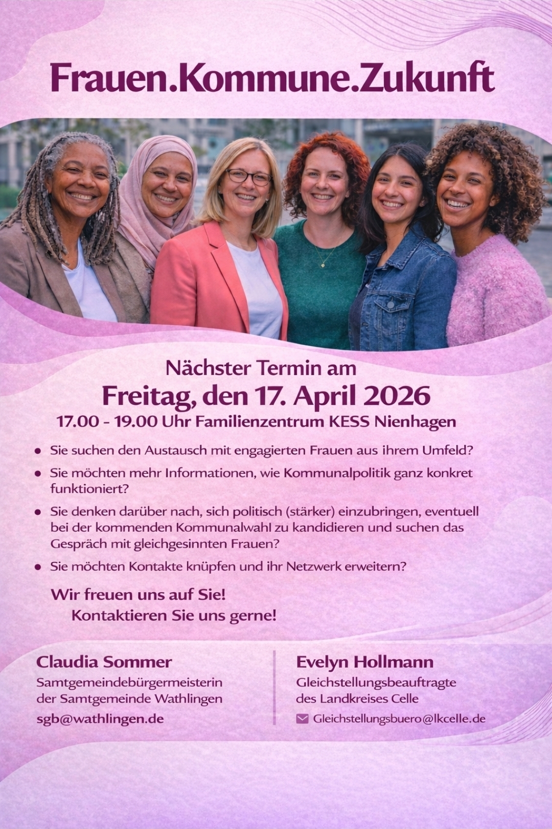 Nach dem erfolgreichen Start des neuen Formats „Frauen. Kommune. Zukunft.“ laden Samtgemeindebürgermeisterin Claudia Sommer und die Gleichstellungsbeauftragte des Landkreises Celle, Evelyn Hollmann zum nächsten Termin am: